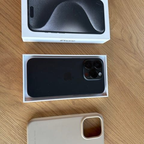 Apple iPhone 15 PRO Black Titanium. mobiltelefon med 128 GB intern lagring. Modellen tillhör iPhone 15-serien. Enheten lämpar sig för vardaglig användning som samtal, meddelanden, surf, appar och media. Lagringsutrymmet på 128 GB ger plats för appar, foton, videor och dokument. På bilden syns även 3 mobilskal som kan användas som skyddstillbehör till telefonen. Som ny. Batt % 84. Plus ett privacy skärmskydd.