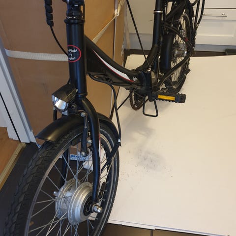 Elcykeln har 20-tums hjul och är utformad för unisexbruk med justerbar sadel och styre för att passa olika längder. Modellen har lågt insteg, pakethållare bak samt skärmar fram och bak. Batteriet är placerat på ramen och cykeln är utrustad med framlykta. Laddare syns på bilderna. Passar för vardagscykling, pendling och kortare turer i stadsmiljö där en kompakt elcykel är praktisk. Framskärmen är trasig. Batteriet räcker i över 20 km. Konverterad till gasavtryckare. Maxhastighet med en vikt på 60 kg är 27 km/h.