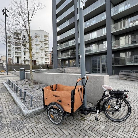 CARGO BIKE OF SWEDEN trehjulig lastcykel barncykel med 12" hjul. Modellen har en främre lastlåda med två mindre hjul fram och ett större hjul bak. Cykeln är svart med brun sadel och är avsedd för barn. Lämplig för både långa och korta turer och lek, där barnet kan cykla och samtidigt lasta mindre saker i lådan framtill.