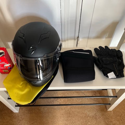 Nolan motorcykelhjälm svart samt motorcykeljacka, byxor, handskar och skor