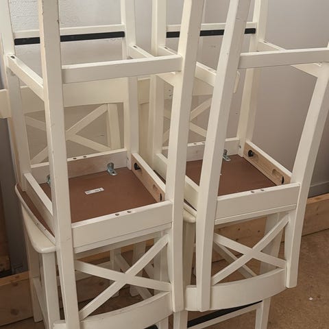 Barstolar med ryggstöd i mörkgrått tyg. Stolarna har smala metallben med fotstöd och hög sitthöjd anpassad för köksö eller bardisk. Sitsen är lätt skålad för bättre sittkomfort. Passar i kök, matplats eller hemmabar där man behöver extra sittplatser vid en högre bänkyta. 500 kr för alla 3!
