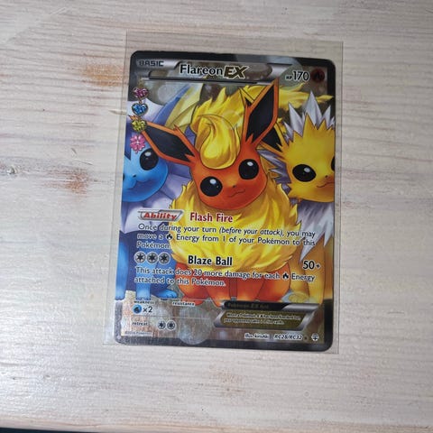 Pokémon Flareon EX samlarkort. Kortet föreställer Pokémonen Flareon i EX-utförande och visar attacker och energikrav på framsidan. Baksidan har standard Pokémon-design för samlarkortspelet. Lämpligt för samling eller spel i Pokémon Trading Card Game.