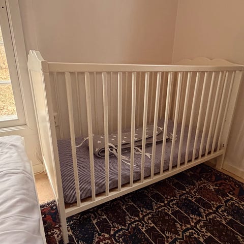 Spjälsäng som vi använt i 6 månader. Fint skick. Madrass ingår, haft madrasskydd på.