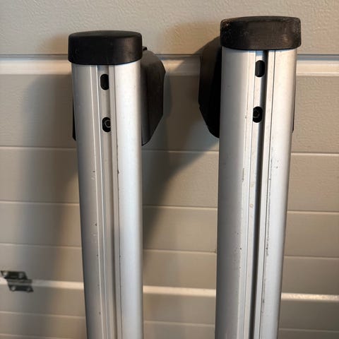 Thule takräcke i aluminium i färgerna silver och svart. Består av två lasthållare med aerodynamiska profiler, fyra fästen (720400) samt tillhörande monteringsdetaljer. De har suttit på våran Toureg