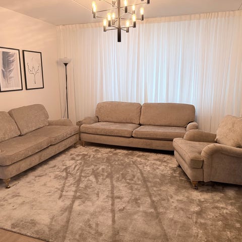 2st soffor nr1. 3-sitt svängd Oxford deluxe fast tyg silver grå färg svart/mässing ben/hjul nr2. 3-sitt Oxford deluxe fast tyg silver grå färg svart/mässing ben/hjul. Båda sofforna är nyskick kostar 6000kr för båda två och 4000kr om man köper för en.