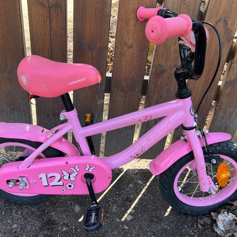 Barncykel med 12" hjul i rosa färg. Utrustad med stödhjul, kedjeskydd, sadel och styre med handtag. Passar mindre barn som ska lära sig cykla och träna balans på en stabil cykel i barnstorlek fotbroms & handbroms
