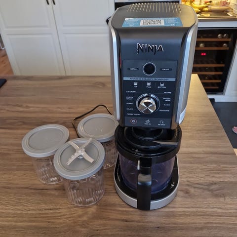 Ninja glassmaskin med tillhörande förvaringsbehållare. Maskinen är avsedd för att göra glass, sorbet och liknande frysta desserter. Tillbehören består av flera genomskinliga behållare med färgade lock för förvaring av färdig glass eller smet. Behållarna kan staplas på varandra för platsbesparande förvaring i frys eller kyl. Utrustningen lämpar sig för hemmabruk i kök och används för att tillreda och förvara olika sorters glass och frysta efterrätter
