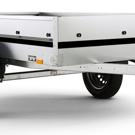 Den V-formade dragstången ger stabilitet på vägen, och den öppningsbara baklämmen gör lastning och lossning smidig.
