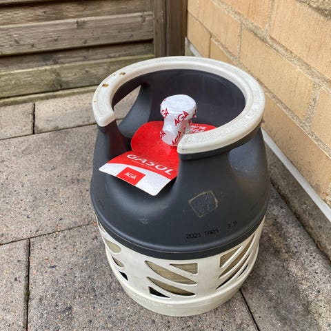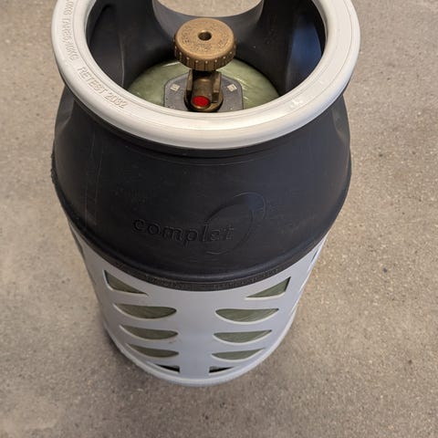 Gasolflaska i kompositmaterial i grå och vit färg. Flaskan har bärhandtag upptill och skydd runt ventilen. Passar för gasol till exempelvis grill, husvagn eller annan gasolutrustning som är kompatibel med denna typ av flaska. Exakt volym och anslutningstyp framgår inte av uppgifterna och bör kontrolleras före användning.