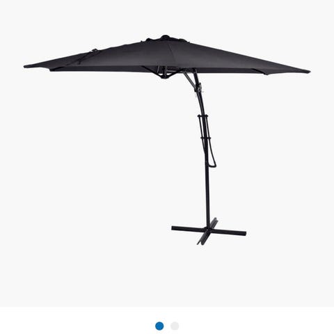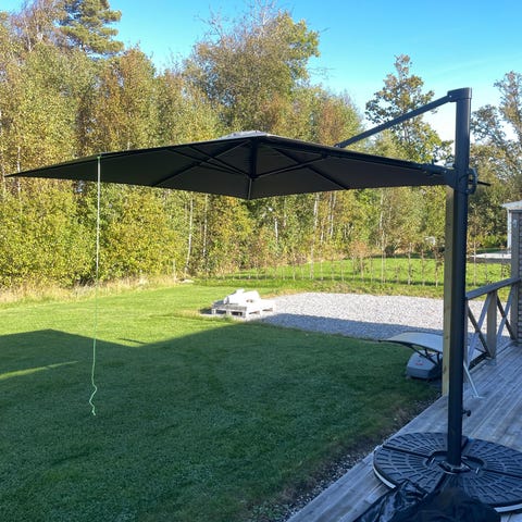 Parasoll i modell hängparasoll i grå färg. Parasollet har sidostolpe och rund fot med tyngder som håller det stabilt.