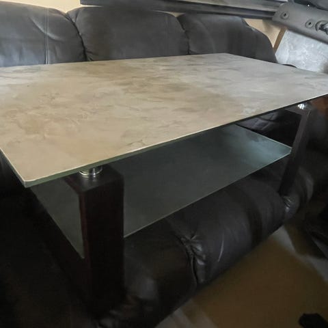 Soffbord, svart glas och metall med mässingsfärgade detaljer på benen. Finns små repor i glasskivan, som syns på nära håll, men inte påverkar helhetsintrycket. Tyvärr har jag inte lyckats fota dem.