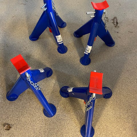Hamron pallbockar med maximal belastning på 2000 kg. Utförande i röd metall med handtag för enklare förflyttning. Avsedda som stöd vid lyft av fordon eller andra tunga objekt där stabil uppallning behövs. Levereras som par enligt bilderna.