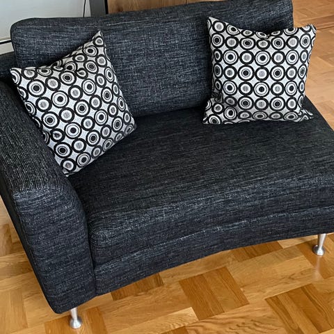 IKEA tvåsits soffa med tillhörande schäslong som också kan användas som fotpall i mörkgråtyg. Soffan har raka linjer, smala armstöd och ben i mörk färg. Passar i vardagsrum, gästrum eller mindre utrymmen då den är liten och praktisk!