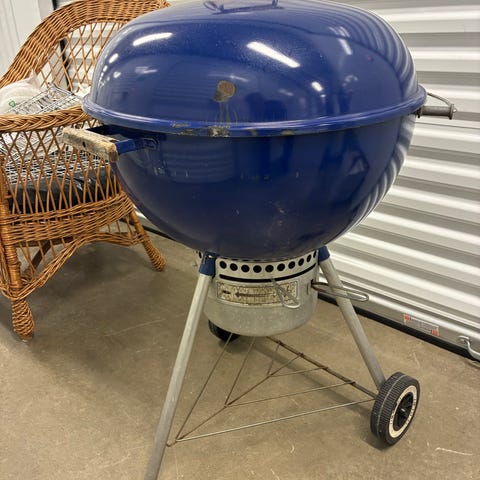 Landmann klotgrill med lock i grå färg. Grillen är kolgrill med rund grillgaller och lock med handtag. Den står på ett stativ med kromade ben. Lämplig för grillning utomhus, till exempel i trädgård eller på campingplats där kolgrill är tillåten. Säljs med tillbehör.