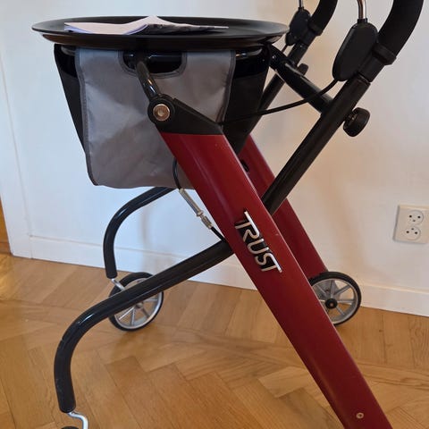 Trust rollator i träfärg. Modellen har fyra hjul, handtag med bromsar samt en rund bricka/avlastningsyta monterad upptill. Passar för inomhusbruk eller plant underlag där stöd vid förflyttning behövs. Konstruktionen är i metall med mindre hjul som gör den smidig att manövrera i trånga utrymmen.