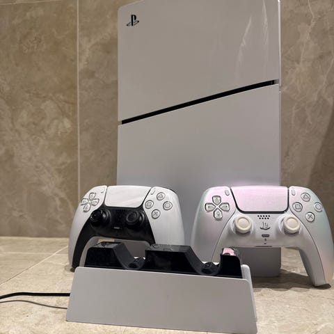 Sony Playstation 5 spelkonsol i vit färg. Konsolen på bilderna är standardmodellen av PS5. Till konsolen hör två trådlösa DualSense-handkontroller i vit och svart färg. Playstation 5 stödjer spel i upp till 4K-upplösning, har inbyggd lagring och olika anslutningsmöjligheter på baksidan för ström, HDMI och USB. Systemet kan användas för spel, streaming av film och musik samt uppspelning av digitalt innehåll via Playstation Network.