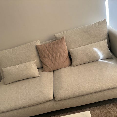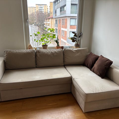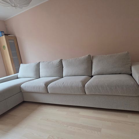IKEA soffa med schäslong i ljusgrått tyg. Soffan har bred schäslongdel på ena sidan och raka sitsar med synliga sömmar. Ryggstödet består av lösa, stoppade ryggkuddar och soffan levereras med flera matchande prydnadskuddar. Klädseln är i mjukt tyg och soffan står direkt på golvet utan synliga ben. Passar som större sittmöbel i vardagsrum eller liknande utrymme.