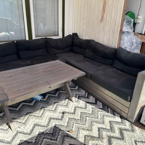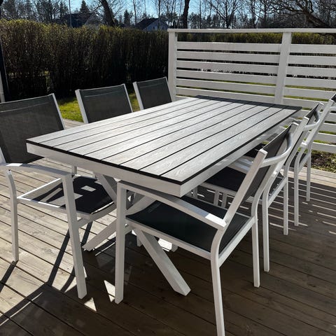 Matgrupp för utomhusbruk bestående av rektangulärt bord och 6 stolar. Bordsskiva i trä med underrede i metall, troligen pulverlackerat i vitt. Stolar med vit flätad sits och rygg i plast, samt metallben i matchande färg. Passar på altan, uteplats eller trädgård som matplats för flera personer.