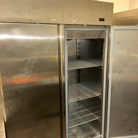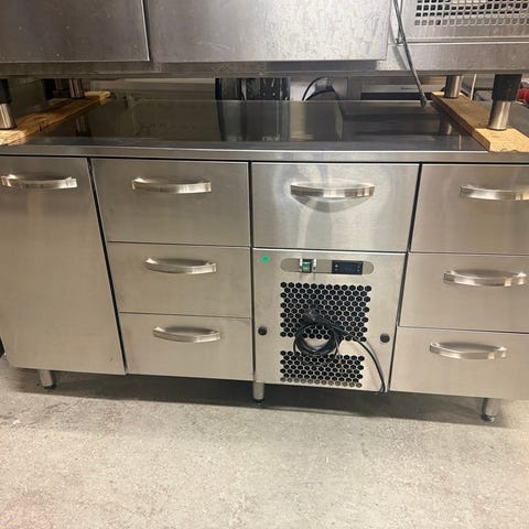 BAMBAS ECO kylbänk i rostfritt stål. Kylbänken har flera dörrar med invändiga gallerhyllor för förvaring av kylda varor. Ytter- och innersidor är i rostfritt material, vilket underlättar rengöring och ger en slitstark yta. Enheten är avsedd för professionella köksmiljöer där man behöver kombination av arbetsbänk och kylförvaring. Märkplåt visar tekniska data som modell, serie- och volymuppgifter samt elanslutning och klimatklass.