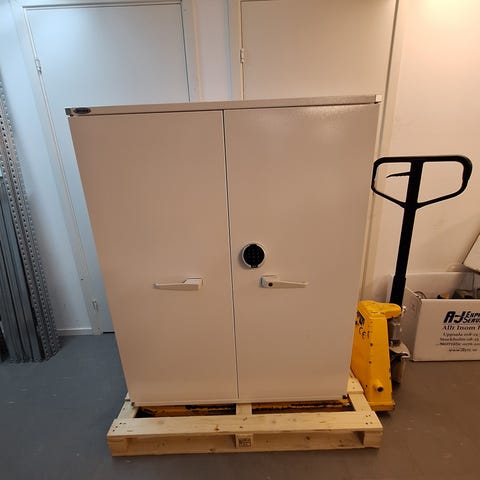 Diplomat OD 1100 dokumentskåp i stål. Skåpet är avsett för förvaring av dokument och värdehandlingar. Utrustat med mekaniskt vredlås och handtag på fronten. Invändigt finns hyllplan med möjlighet att justera höjden via perforerade sidor. Skåpet är märkt med brandklass 90P enligt NT Fire 017, vilket avser brandskydd för papper. Passar för kontor eller hemmiljö där säker förvaring av dokument behövs.