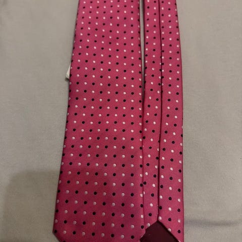 Elegant slips från Portia i en varm röd nyans med ett diskret mönster av små blå och grå prickar. Slipsen har en klassisk design som passar utmärkt för både formella tillfällen och för att addera en sofistikerad touch till vardagslooken. Den är försedd med originaletiketter.