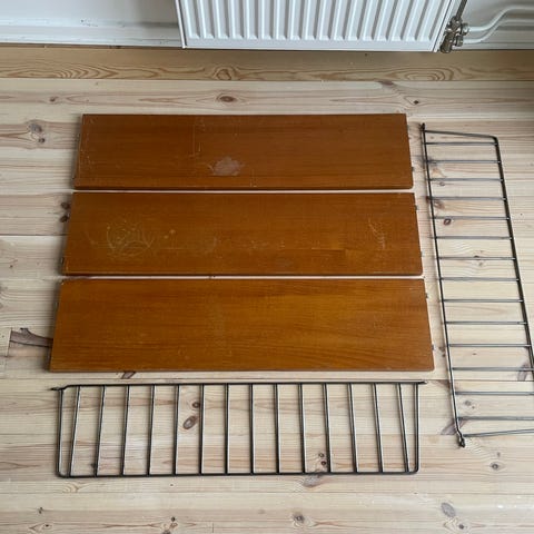 Hyllan är en äldre modell och ger ett riktigt fint vintageintryck. Två av hyllplanen är märkta med “BFB hyllan string design”, vilket gör den extra intressant för samlare eller designintresserade. 🔍