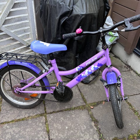 Yosemite barncykel med 16" hjul. Cykeln har rosa ram, sadel och handtag samt vita stänkskärmar. Utrustad med kedjeskydd och reflexer. Passar yngre barn som behöver en mindre cykelstorlek med 16-tums hjul.