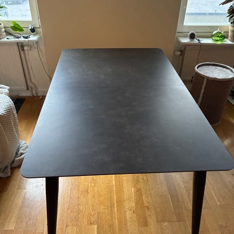 IKEA bord med rektangulär bordsskiva i svart med marmorerat mönster. Fyra raka ben i svart. Passar som matbord, skrivbord eller arbetsbord i kök, vardagsrum eller arbetsrum. Mått ges vid intresse.