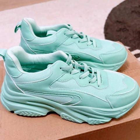 Ett par mintgröna sneakers med en chunky sula. Skorna har snörning framtill och en dragflik baktill för enkel påtagning. Insidan är vadderad för komfort. Skorna har en robust yttersula med bra grepp.