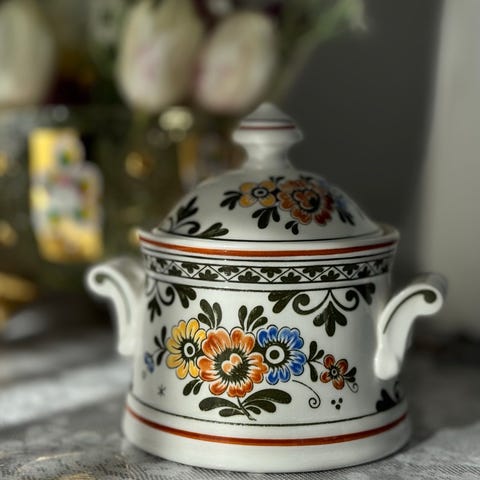 Burken ingår i en serie med olika landskaps- och blommotiv, och passar perfekt som komplettering till befintlig samling eller för dig som uppskattar äldre kryddburkar i porslin.