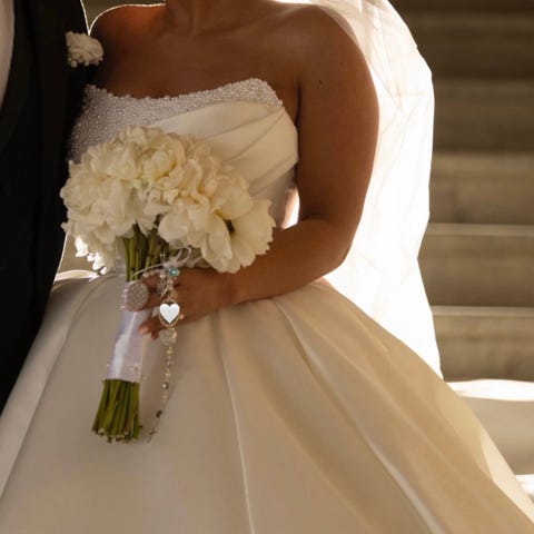 Släpet är ca 2.5 meter. Säljer med brudslöja och underkjol.