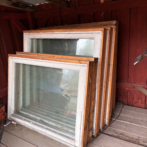 Träfönster med spröjs. Flera fönster i liknande utförande syns på bilderna, med karm och glas monterade. Fönstren är av trä med glasrutor indelade i mindre fält med spröjs. Passar exempelvis till hus, fritidshus eller uthus där man önskar klassiskt utseende på fönstren.