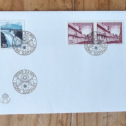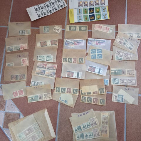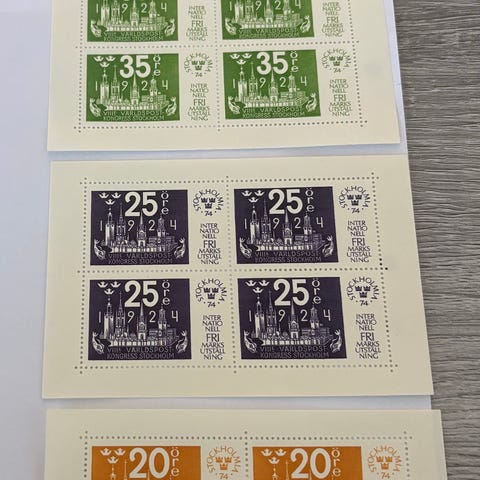 Sverige frimärken och frimärkshäften med motiv postflyg och ånglok. Flera frimärken sitter på ark med stämplar, bland annat stämplade med "Örebro" och datum. De blå frimärkshäftena är märkta med valör 2:- och innehåller olika motiv, bland annat flygplan och lokomotiv, samt svenska frimärken med valör 5. Lämpliga för frimärkssamling eller som samlarobjekt för svensk posthistoria och transportmotiv.