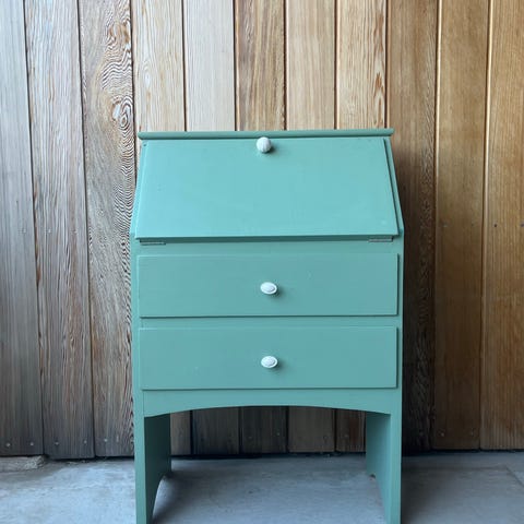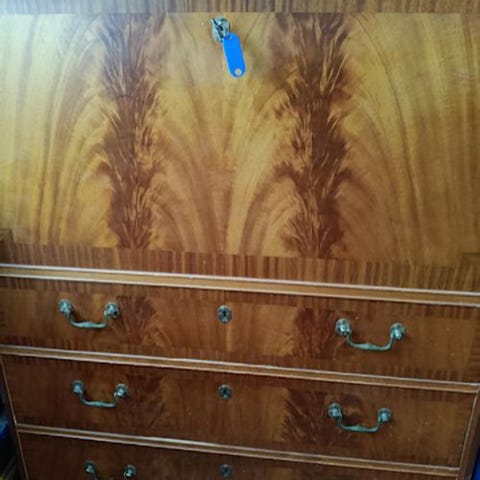 Sekretär i ljust träslag med lejontassar. Två lådor och sex smålådor. Nyckel finns och lås fungerar. När locket är utfällt är djupmåttet 75cm.