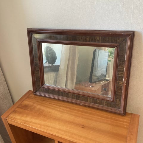 Byrån har flera praktiska lådor både upptill och framtill med gott om förvaring. Spegeln har den patina som hör åldern till och ger möbeln extra charm.