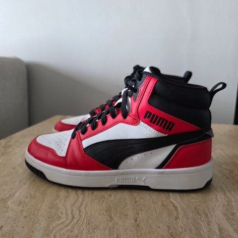 Hugo Boss sneakers i hög modell för pojke i storlek 40. Skorna är huvudsakligen svart och vit med röda Hugo-detaljer. Ovandelen har perforerade partier och kombinerar textil och mockaliknande material. Modellen har snörning framtill och platt yttersula i gummi. Passar som vardagssko eller fritidssko för pojke.