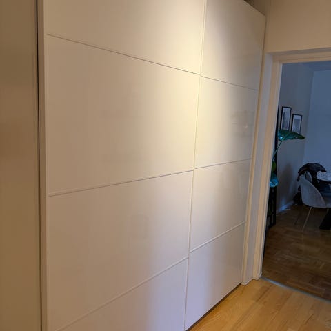 En fin garderob från IKEA köpt för några år sedan men är i väldigt bra skick. Fin matt färg med två skjutdörrar och två klädstänger samt hyllplan och en utdragbar låda.