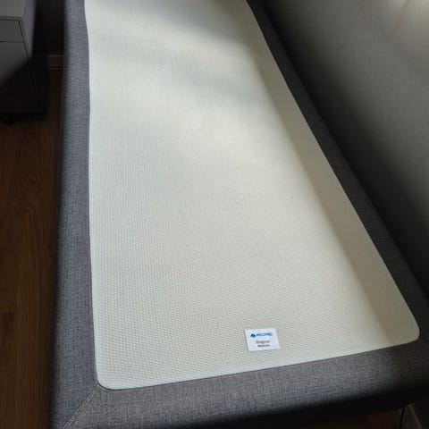 Säng med resårmadrass i grått tyg. Överdelen består av en resårmadrass med slät, ljus liggyta och quiltad, grå sidor. Underdelen är en sängbotten i matchande ljusare tyg. Passar som vanlig säng i sovrum eller gästrum. Exakta mått och material är inte angivna.