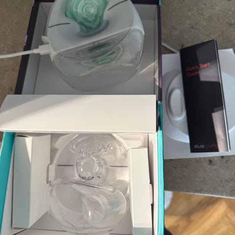 Elvie Pump bärbar bröstpump. Elektrisk, tystgående bröstpump som bärs i behån för handsfree-pumpning. Består av pumpenhet med laddningskabel, uppsamlingskärl och tillhörande delar i plast och silikon. Levereras med bruksanvisning och originalförpackning enligt bilderna. Lämplig för ammande personer som vill pumpa diskret och mobilt.