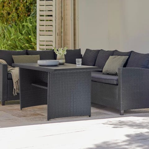Sunfun Öregrund loungeset i svart konstrotting. Hörnsoffa med generösa sitt- och ryggdynor samt tillhörande bord. Passar för uteplats, altan eller trädgård där man vill ha en samlad sittgrupp för flera personer. Konstrotting är ett material som är anpassat för utomhusbruk och är enkelt att rengöra.
