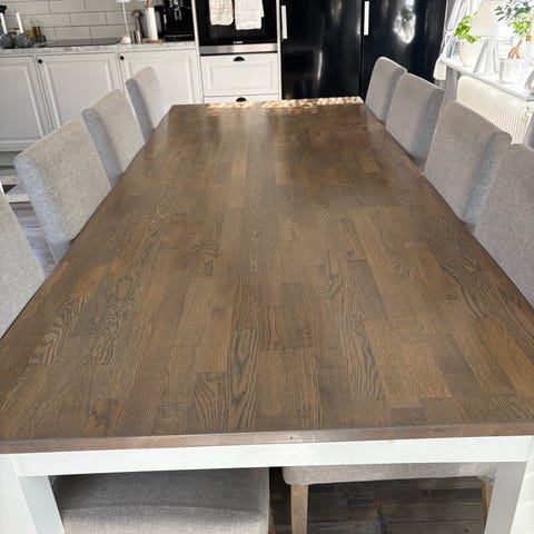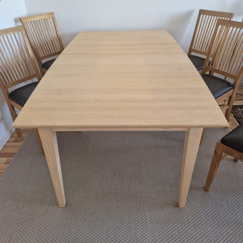 Massivt ekbord med iläggsskiva och 6 stolar.