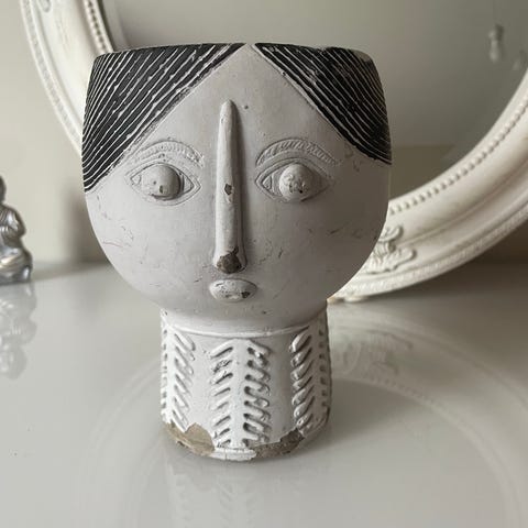 kruka i vit keramik med dekorativt ansiktsmotiv på utsidan. Passar för mindre växter eller som inredningsdetalj på bord, hylla eller fönsterbräda. Enkel att kombinera med andra krukor och inredningsföremål i hemmet.