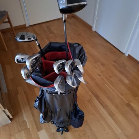 Cobra Bio Cell järnklubbor 5-P, höger dam. Cobra bio cell driver samt en Cobra golfbag. Har endast använts ett fåtal gånger och är i mycket fint skick. Ligger även ett paket TaylorMade Burner lady golfbollar 9 stycken i bagen.