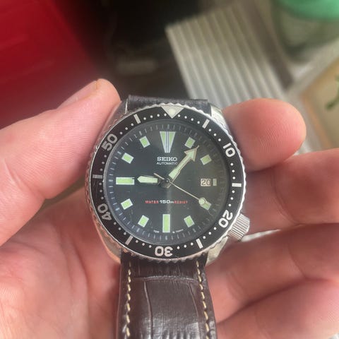 Detta är gen1 utan den oestetiska lumepluppen vid datumet. Klockan håller tiden väl (definitivt inom spec) och gångreserven är god. Drar upp mjuk och kronan gängar in fint. Kommer fullset, samt kvitto från det ovan nämnda jobbet. Garanikort stämplat Gnomon Watches juli 2020. Finns knappa spår av användning, mest på clasp och ngn pytteliten nagg på bezelinsert. Denna kan jag inte se med blotta ögat men känner den med fingernageln. Originallänk sitter monterad och passar min handled på 18 cm. Finns ytterligare en länkbit och justermån kvar i spännet.