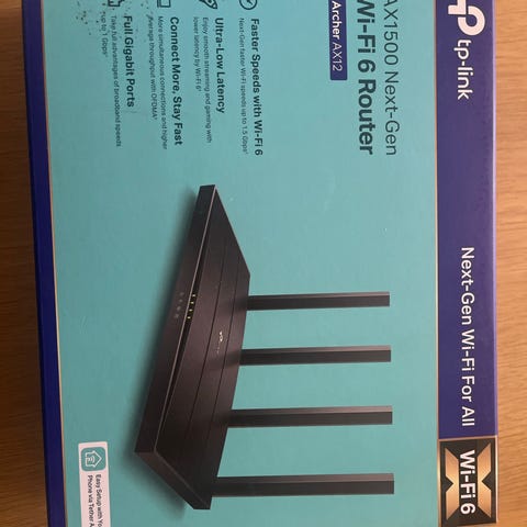 Oöppnad TP-Link Archer AX21 router med stöd för Wi-Fi 6 (AX1500). Routern har flera externa antenner för bättre täckning och stabilitet. Den är avsedd för trådlösa hemnätverk och erbjuder gigabit-portar för trådbunden anslutning av datorer, TV eller andra nätverksenheter. Passar för användning med internetdelning i bostad eller mindre kontor där både trådlös och trådbunden uppkoppling behövs.