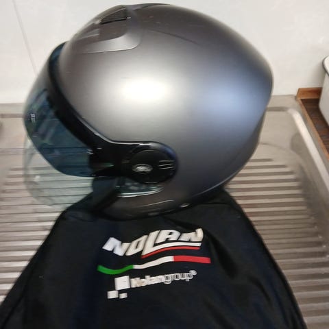 Nolan N21 öppen mc-hjälm i mattsvart färg med integrerat visir. Hjälmen har hakspänne och är avsedd för motorcykel- eller mopedåkning. Förvaringsväska från Oxford ingår enligt bild.