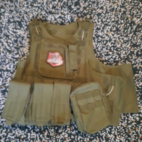 Väst med utbytbara paneler (plattbäraren levereras med en MOLLE panel med plats för 3st M4/AK magasin) och snabbkoppling vid av/på tag.