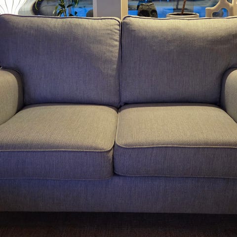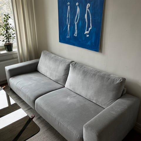 Bröderna Andersson, Ekenässjön AB. Finfin soffa i lingrön färg med sametstyg. stomme av betsad bok. Tre sitsar men ändå liten och nätt. Passar bra i mindre etta tex.