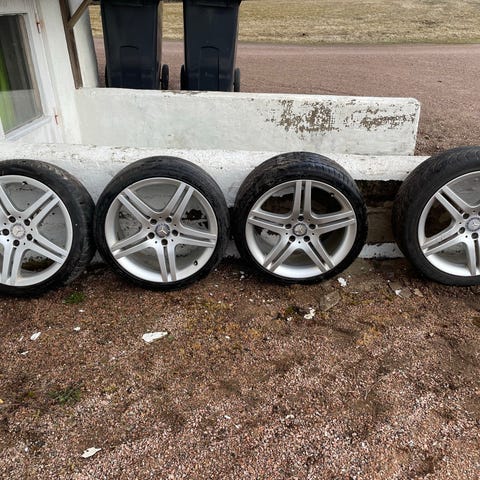 Fälgar och däck till Mercedes, fälgarna är felfria men däcken NOKIAN är slitna, ca 3-4 mm kvar därav priset. Alla fälgar är ET40. 7,5J x 17 H2. Dimension på däcken är 225/55R17. Suttit på en CLS 2016