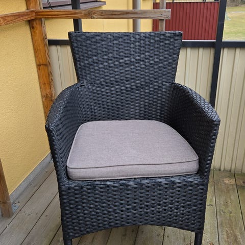 4st trädgårdsfåtöljer i mörkgrå plast med rottingimitation. I använt men gott skick. Stabila. Sittdynor ingår.